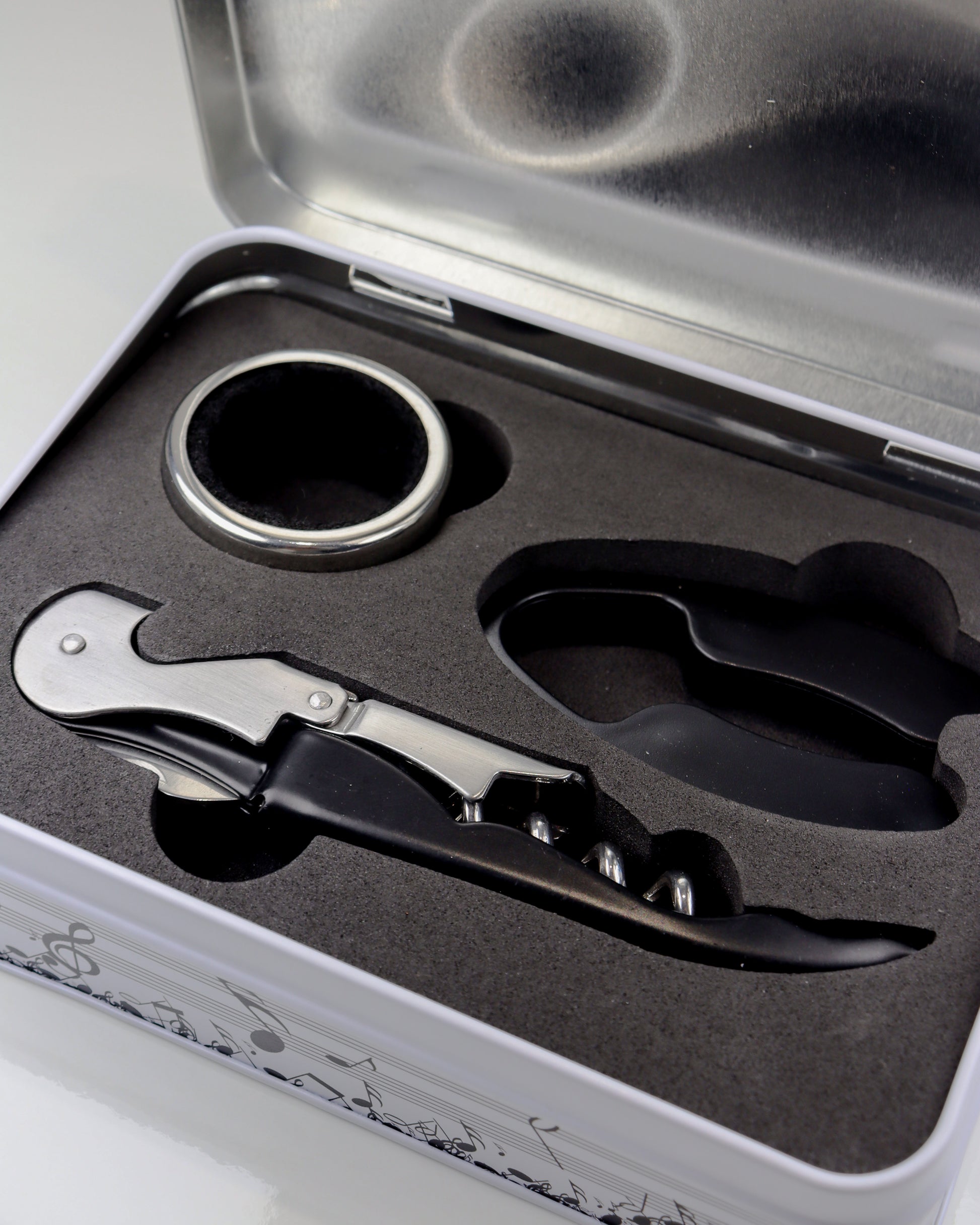 Conjunto de acessórios de vinho apresentado numa caixa metálica com design musical. Pensado como um presente cuidado, onde a música, o ritual e a atenção ao detalhe se encontram.